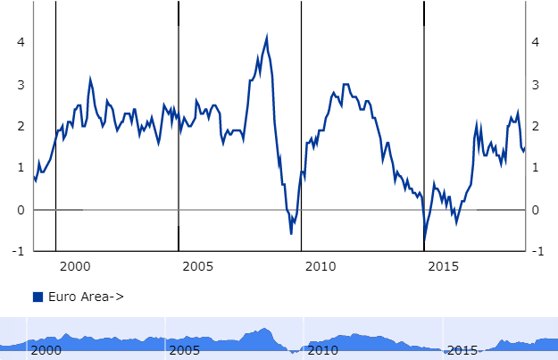 Inflation is a major determinant for the success of the central bank's monetary policy, as higher prices in the retail sector are a necessary condition to sustained growth in output for the private sector, which is the end goal for the ECB's policy of `easy money` into the economy. Yet, the inflation rate is disappointing at present, with the projection for 2019 misfiring from the desired 2.00% level with 0.8% to only 1.2%.