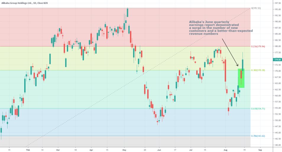 Following the release of the earnings report, the share price of Alibaba closed Thursday’s trading session at 166.97, which amounted to a 3.03 per cent increase. Thus, the share price reached and closed just below the major 38.2% Fibonacci retracement level of 170.30. Then, on Friday, the price managed to break above that fundamentally important resistance level by adding an additional 4.57 per cent gains.