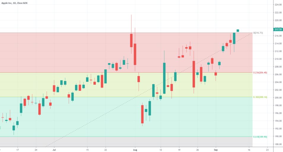 The share price of Apple Inc. did not register any significant gains during today's market open and is currently trading at 217.55 dollars per share, which is just above the significantly important resistance level of 216.73.