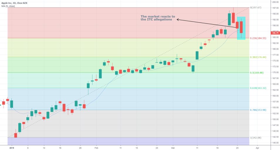 The news that specific imported iPhone models could potentially be banned due to patent infringement issues caused the price of Apple shares to fall with as much as 4.87 dollars per share.