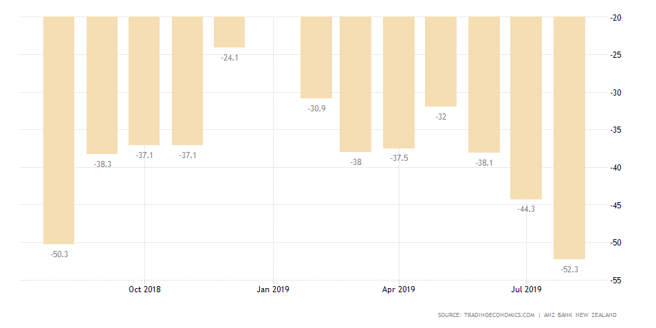 According to ANZ, the overall business confidence sentiment among retailers, service retailers and other small businesses in New Zealand has deteriorated for the fourth consecutive month. The index fell from -44.3 in July to -52.3 in August, which compelled the ANZ to adjust the overall business sentiment outlook from "Grim" to "Nothing good to say about it". In the report, it was additionally stated that: