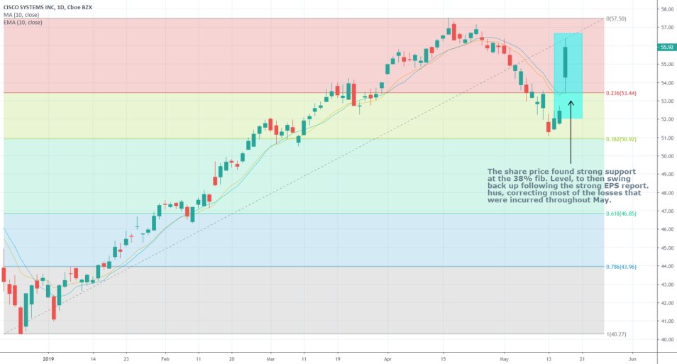 Because of the overwhelmingly positive earnings report, CISCO’s stock rose with 6.64% throughout Thursday’s trading session. The price opened with a massive gap at 54.27 from Wednesday’s closing price at 52.44, and it went on to eventually close at 55.92.