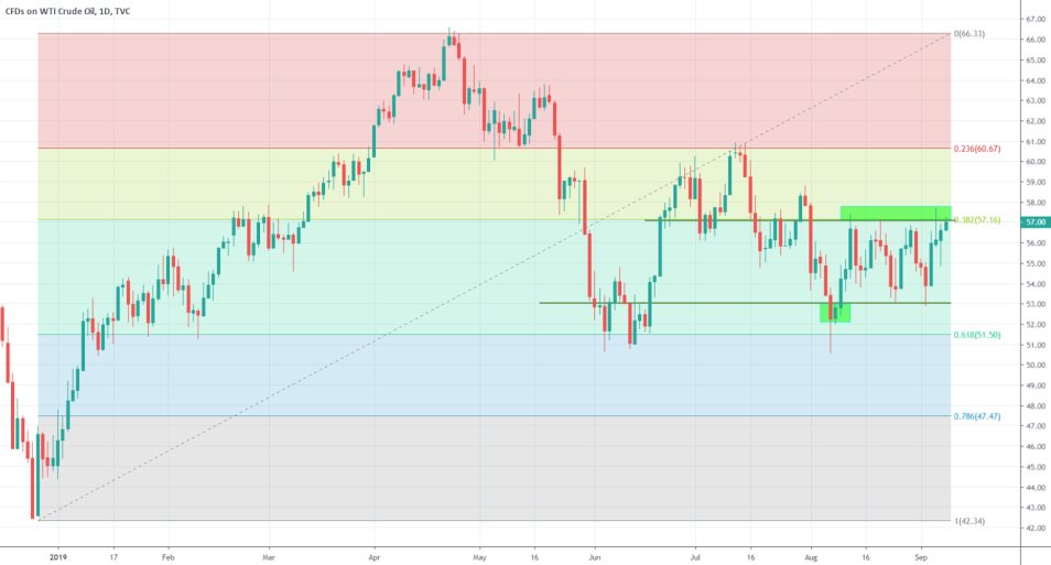 Currently, the price of the precious commodity is trading at 56.97 per barrel in a narrow consolidation range, just below the 38.2 per cent Fibonacci Retracement level of 57.16. This resistance level has been prevailing since the beginning of August.