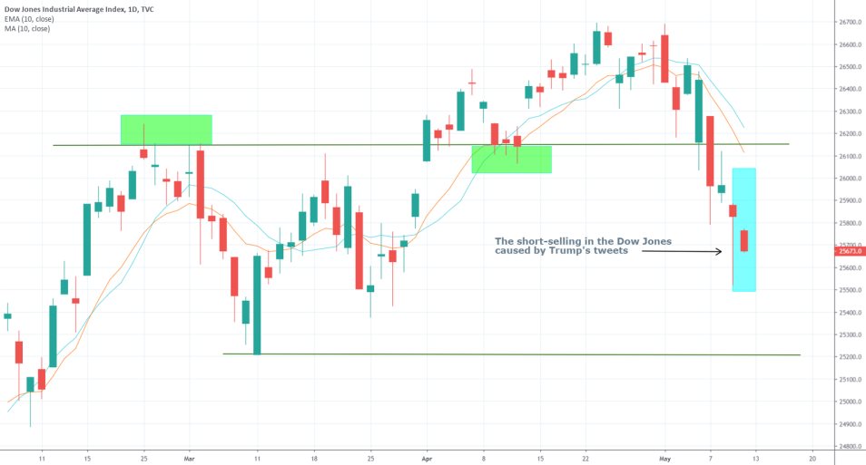 The Dow Jones Industrial has depreciated with almost 3% in the past several days, as Trump’s tweets become more and more explicit, and investors are becoming increasingly worried that the recent escalation of the renewed tensions between China and the US can once again throw the international trade into a slump. As a result of the most recent posts, as shown above, the DJI opened in today’s trading session with another -0.47% gap.