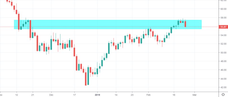 In case that after this initial volatility is exhausted and the price level is above this support, then this would be an indication that the short-term trend remains with a positive outlook. However, should the price break and close below the 55.38 level, then this might indicate that the market is ready to enter into negative territory.