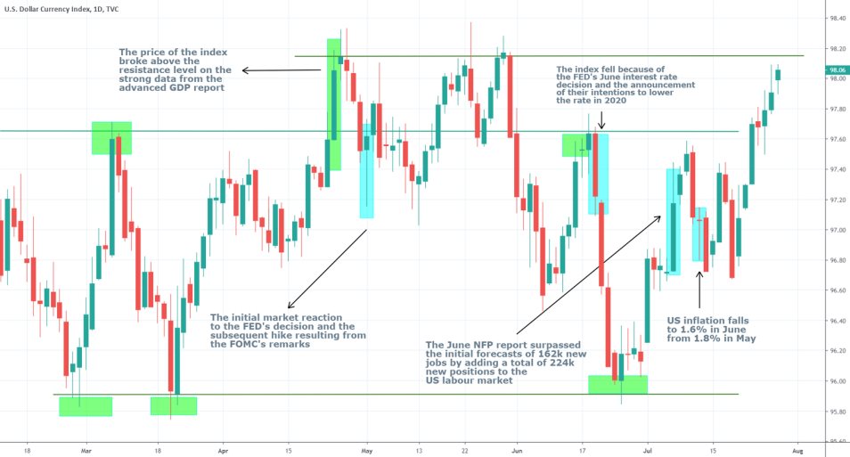 The US Dollar Currency Index is currently trading at 98.03, which is just below the 98.15 resistance level that has been last tested on the 30th of May. The index has been rising more or less steadily since last week and depending on just how much the market has been able to price in a rate cut on Wednesday, the resistance level should be able to hold, even though the expected high volatility following the interest rate decision announcement might send the price temporarily above the level.