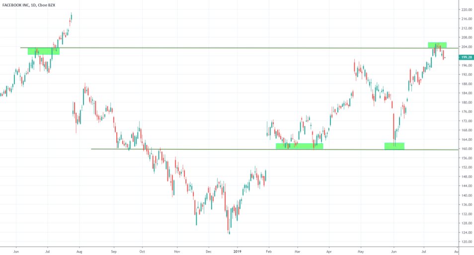 The share price of Facebook is currently trading at around 199 dollars, and it is just below the fundamentally critical level of 200, which has a psychological significance because of the two zeros. Moreover, the price is consolidating below the historically important resistance level at 203.43. It managed to break above it last week temporarily, but it was to no avail as the price eventually broke below it once again. The last time when the price was trading above this resistance level was in July of 2018.