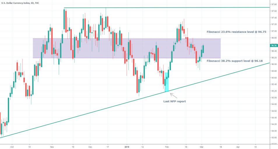 As we can see from the above daily chart of the Dollar Index spot, the price action has formed a bullish flag and currently is trading between the fundamentally significant Fibonacci levels of 23.6% and 38.2%. On the last NFP release date, the actual data pushed the US dollar index in an upswing, which can be expected again, provided that the data on Friday manages to exceed expectations. Overall, we can expect the price to test the range's boundaries in the mid-term which are respectively 97.70 and 95.60