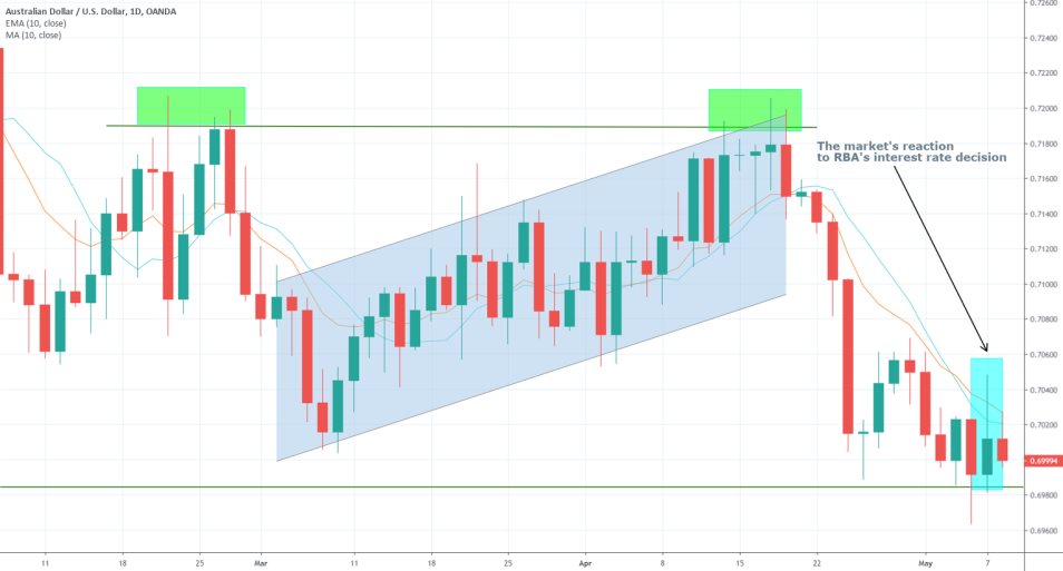 The AUDUSD initially found strong support by the somewhat surprising decision by the RBA to abstain from decreasing the interest rate, and hence the currency pair appreciated to 0.70483 from the opening price of 0.69915, but then the price quickly corrected itself and eventually retracted to 0.70118, which was the closing price for the trading day. Ultimately, the previously outlined support level at 0.69841 remains strong, and the AUD/USD consolidated itself above it and below the 10-day EMA.
