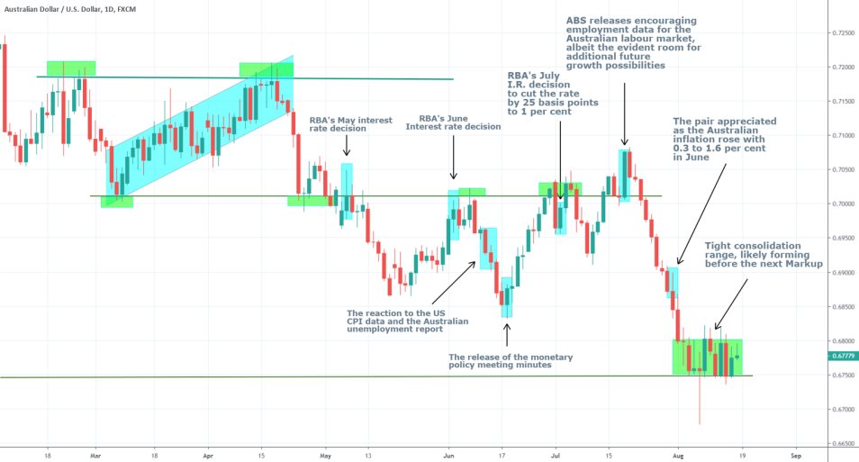 Overall, the AUDUSD pair is still trading in a tight consolidation range just above the fundamentally important support level of 0.67400, which resembles quite closely an Accumulation phase that is currently forming after the major Downtrend and is a part of a larger Wyckoff cycle. Thus, the market continues to prepare for the development of a forthcoming bullish trend.
