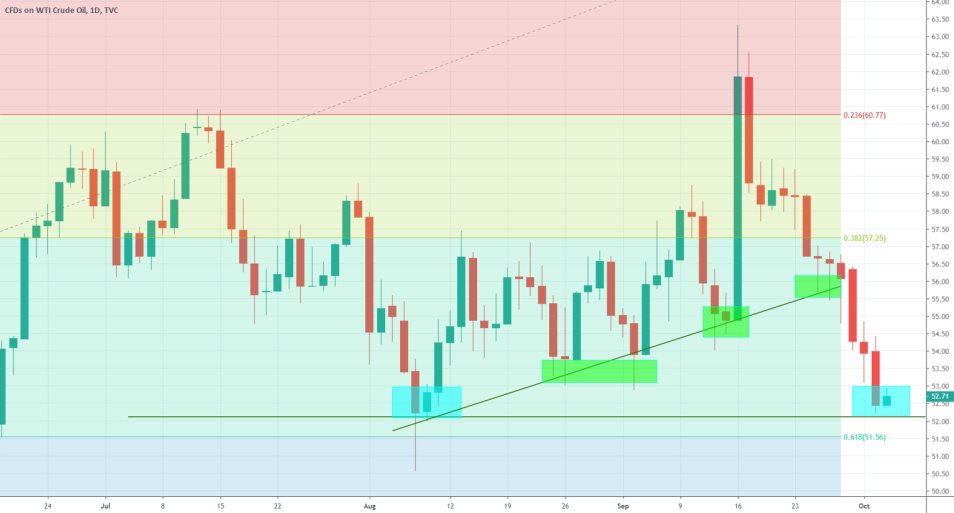 Consequently, the crude fell by 2.80 per cent during Wednesday’s trading session and the current price of 52.72 dollars per barrel is nearing the crucial support level of 57.10