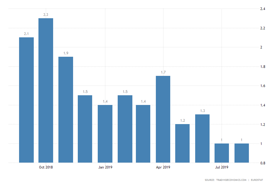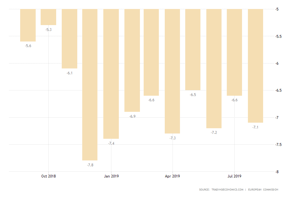 Overall, the economic situation in the European area continues to suffer from the global downside risks to growth, which stem from the prolonged uncertainty to international trade resulting from the impasse in the negotiations between China and the US. Because of this registered trade uncertainty globally, the inflationary pressures have been impeded by low levels of spending and reinvesting in the economy, exhibited by the poorly performing consumer confidence index.