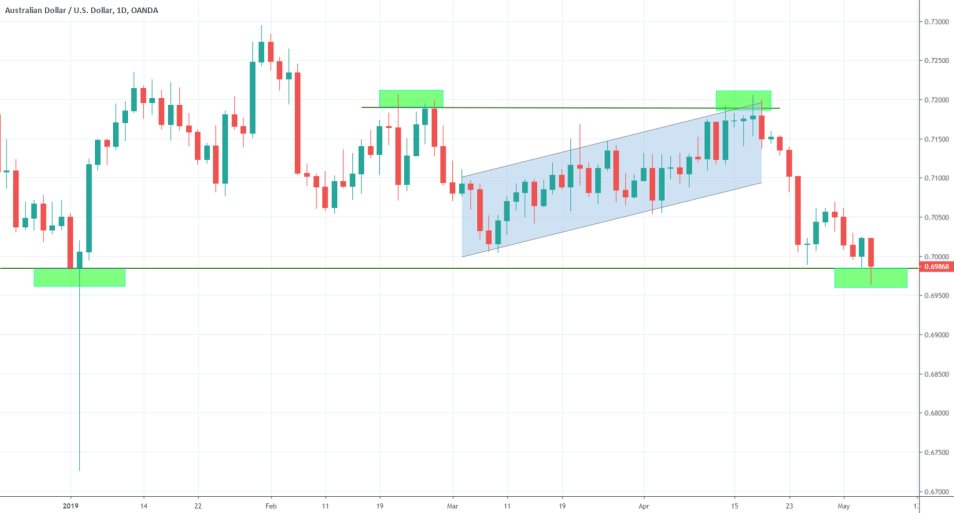 The AUDUSD is currently testing the bottom line and support level of 0.69884 which is a part of the established range on the daily chart. Provided that the market has not priced in a potential lowering of the interest rate, the price action is likely to test the strength of the support level by the end of this week.