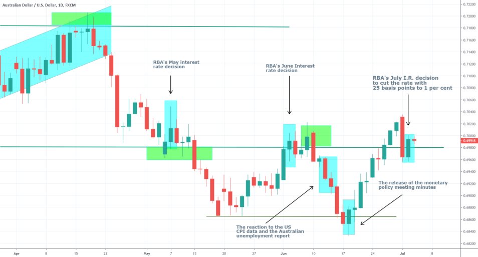 Because the broader market expected the decision and there were no significant surprises to follow from the release of the statement of the Board of Directors, the market did not react very definitely to the news of the rate cut. The AUDUSD pair appreciated with a 0.43% during yesterday's trading session and broke above the significant resistance level at 0.69800.