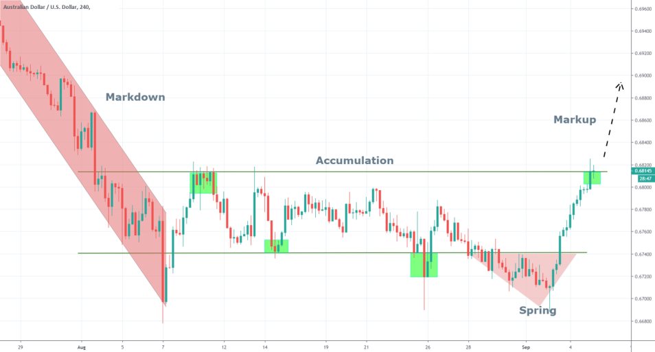 The AUDUSD appreciated with 0.68 per cent on Tuesday after the monetary policy statement was released, and in doing so, the price of the pair managed to get back within the boundaries of the previously outlined range. The AUD/USD is enjoying its third consecutive day of gains, and the price is currently testing the upper-boundary of the range at 0.68150. Should the pair manage to break out above that resistance, the price could be said to have broken above the Accumulation's area, and the formation of a new markup stage could be attempted.