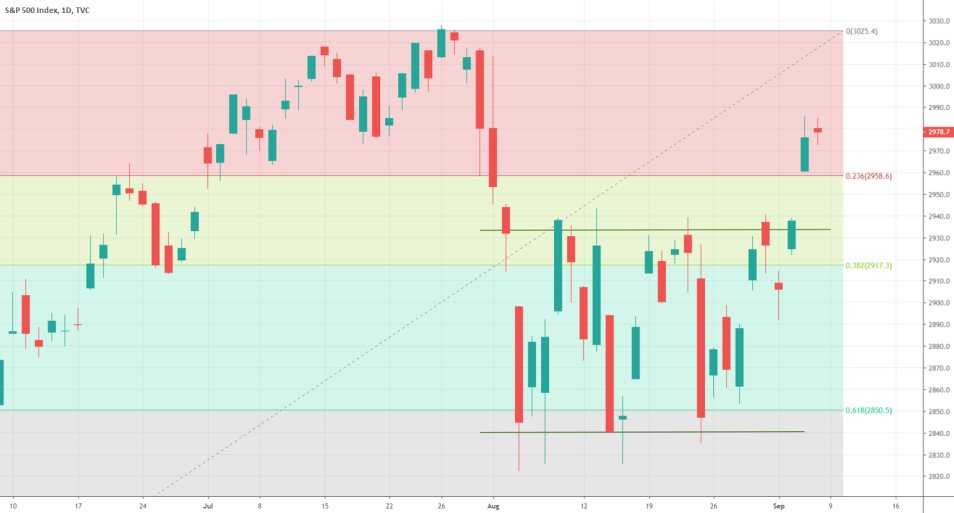 The S&P 500 has managed to break above the consolidation range, which was outlined in our market update from the 14th of August, and is currently trading above the 23.6 Fibonacci Retracement Level at 2978. In case that the two economic reports present findings of robust inflationary performances this week, the index might be boosted to test the fundamentally critical level of 3000.