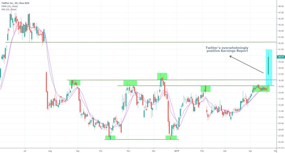 As a result of that, the share price of the social media company jumped with 15.64%, closing only 23 cents shy of the 40 dollars’ mark at 39.77. Yesterday’s trading session opened with a huge gap, following Monday’s closing price and the respective termination of the range at 34.39.