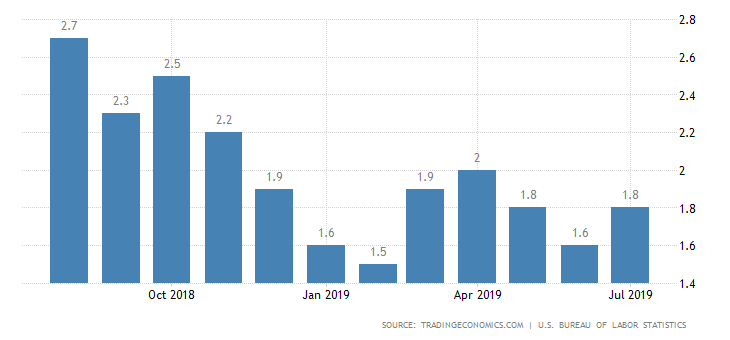 The Bureau of Labor Statistics in the United States reported a monthly gain in the CPI with 0.3 per cent for the month of July, which in turn resulted in a rising inflation rate over a 12-month period before seasonal adjustment to 1.8 per cent, from the previous rate of 1.6 per cent for June.