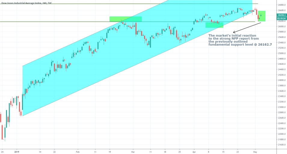 Despite the misfire in the hourly earnings data, the market reacted vigorously to the robust labour data, and the Dow Jones Industrial opened with a +0.51% gap at 26379.1 from the previous day’s 26307.8 closing price.