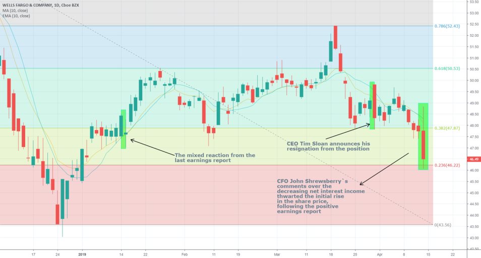 The company shares initially jumped on Friday's pre-market trading session with more than 2%, after the overwhelmingly positive earnings report. Wells Fargo reported 1.20$ earnings per share beating the initial estimations for just 1.09$ EPS. The revenue stream also beat the initial forecast of 21.012$ billion with a final tally of 21.609$ billion, which resulted with an initial price jump of the company's stock with over 1 dollar, reaching 48.82 USD per share.